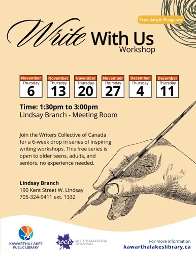 Join the Writers Collective of Canada for a series of free drop-in, inspiring writing workshops. These free sessions are open to older teens, adults and seniors, no writing experience needed.